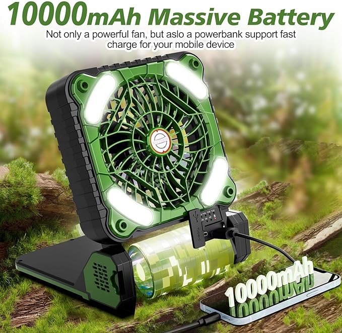 - Durable and Portable Design: Crafted from rugged ABS material, the fan housing is sturdy and resistant to impacts, ensuring durability in outdoor environments. Despite its robust construction, the fan remains compact and lightweight, making it easy to carry in a backpack. Whether you're traveling, fishing, camping, or working outdoors, this versatile fan is an ideal companion for staying cool and comfortable. Additionally, it supports reverse charging, serving as a power bank to charge your mobile devices in emergencies.